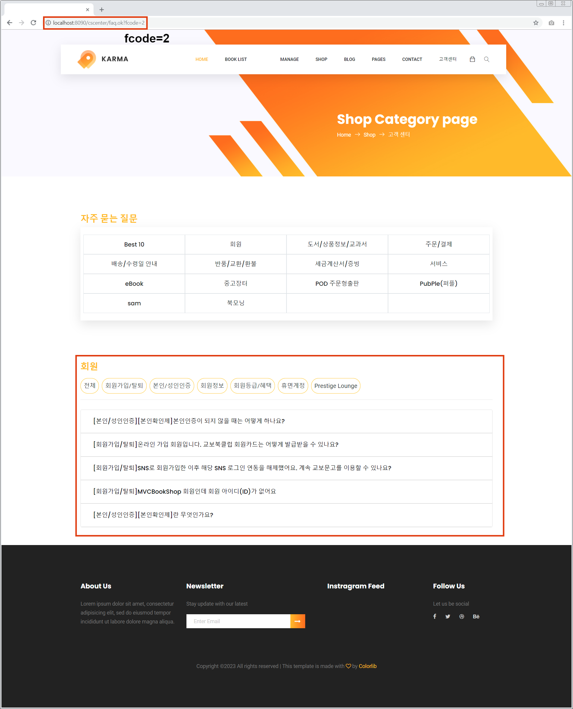 요청한 URL은 http://localhost:8090/cscenter/faq.ok?fcode=2로 새 페이지 응답그리고 분류되었다 영역 하단에는 ‘도서/상품정보/교과서’에 해당하는 모든 FAQ 데이터가 인쇄되고 있는 것을 확인할 수 있습니다(빨간색 상자).