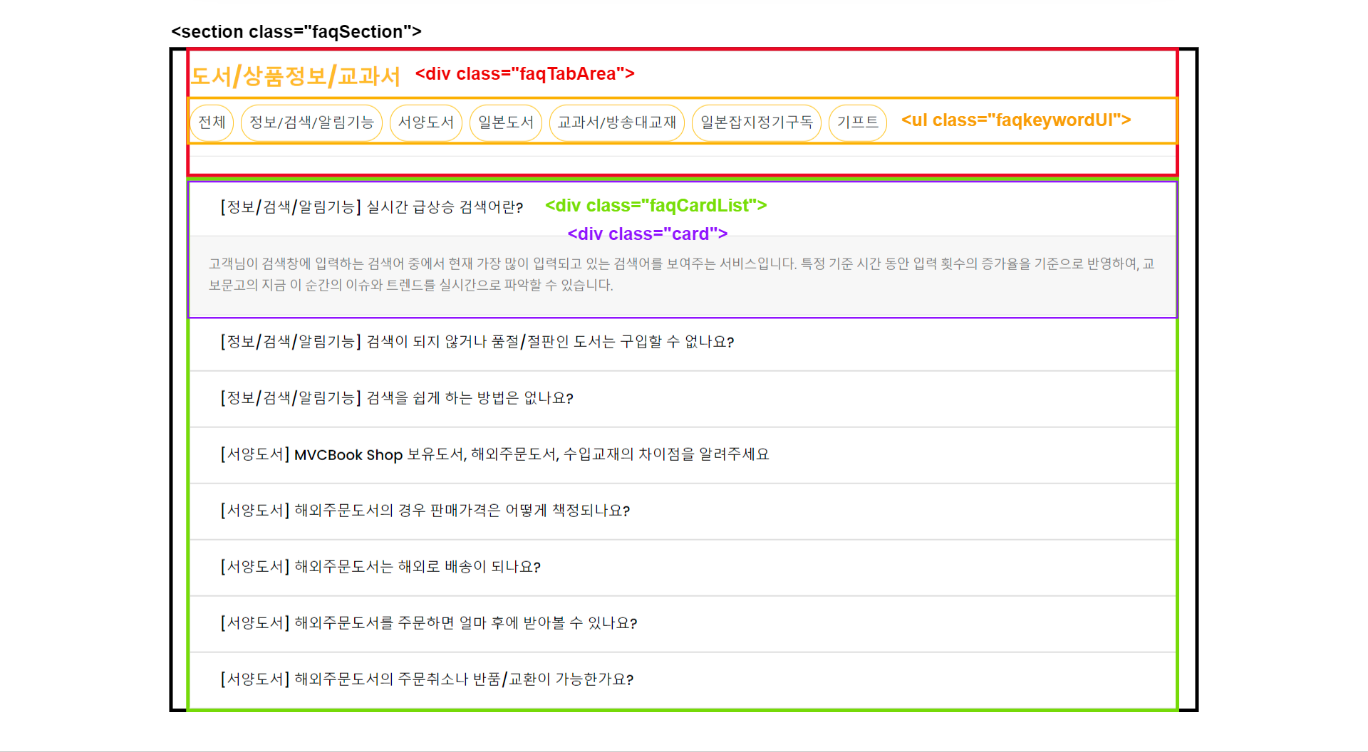살펴보는 부분 하위 카테고리 카테고리와 FAQ 질문/답변이 표시되는 영역의 HTML입니다. 나중에 AJAX로 데이터를 가져와서 아래 영역에 붙일 때 붙여넣을 영역의 클래스명으로 접근하게 됩니다.